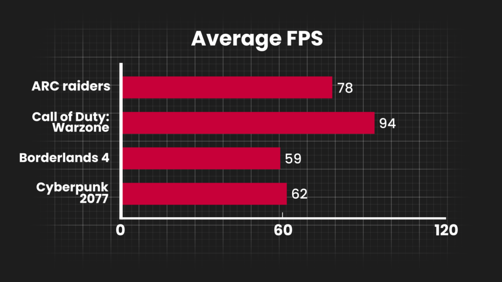 Borderlands 4: Averaging 59 FPS. This sits right on the edge of the “golden standard” for smooth gameplay, showing that for next-gen titles, you may need to rely on DLSS upscaling to push frame rates higher.